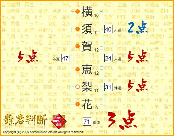横(16画)須(12画)賀(12画) 恵(12画)梨(11画)花(8画)