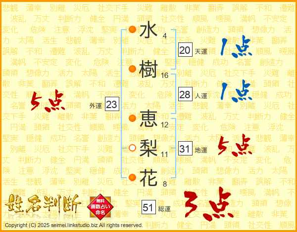 水(4画)樹(16画) 恵(12画)梨(11画)花(8画)