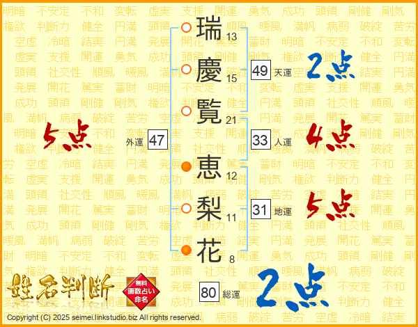 瑞(13画)慶(15画)覧(21画) 恵(12画)梨(11画)花(8画)
