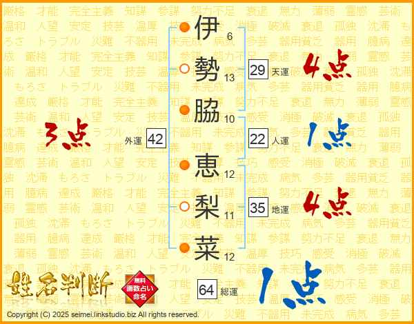 伊勢脇恵梨菜さんの天運は29画の4点!
