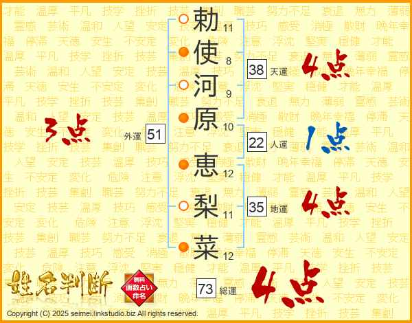 勅(11画)使(8画)河(9画)原(10画) 恵(12画)梨(11画)菜(12画)