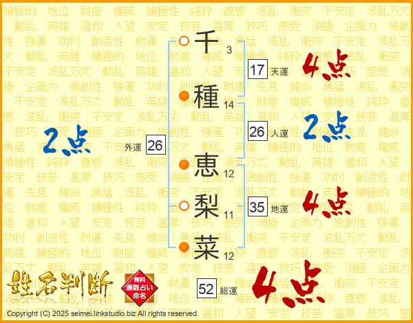 千(3画)種(14画) 恵(12画)梨(11画)菜(12画)