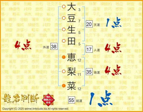 大(3画)豆(7画)生(5画)田(5画) 恵(12画)梨(11画)菜(12画)