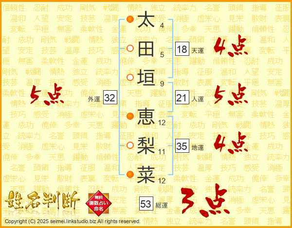 太(4画)田(5画)垣(9画) 恵(12画)梨(11画)菜(12画)