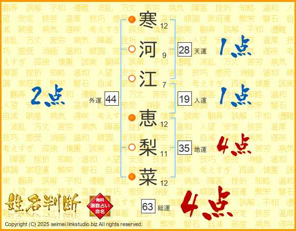 寒(12画)河(9画)江(7画) 恵(12画)梨(11画)菜(12画)