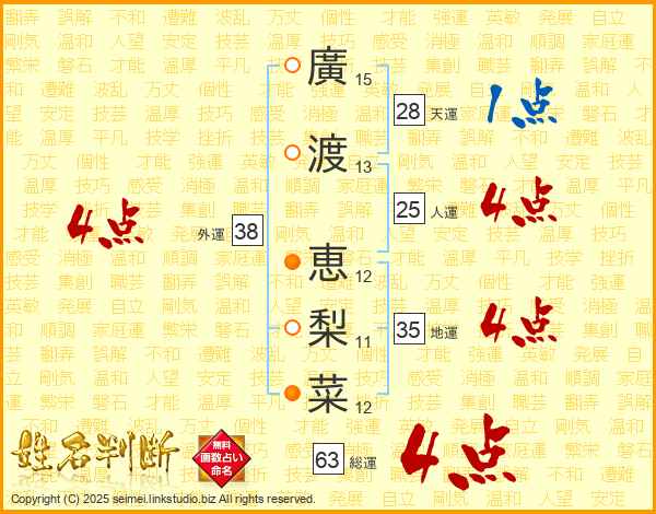廣(15画)渡(13画) 恵(12画)梨(11画)菜(12画)