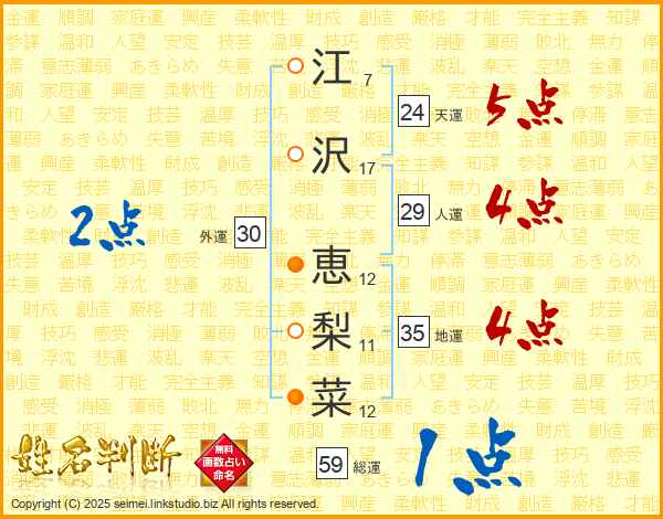 江(7画)沢(17画) 恵(12画)梨(11画)菜(12画)