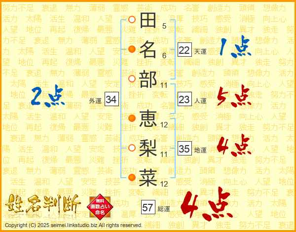 田(5画)名(6画)部(11画) 恵(12画)梨(11画)菜(12画)