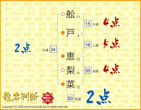 舩(11画)戸(4画) 恵(12画)梨(11画)菜(12画)