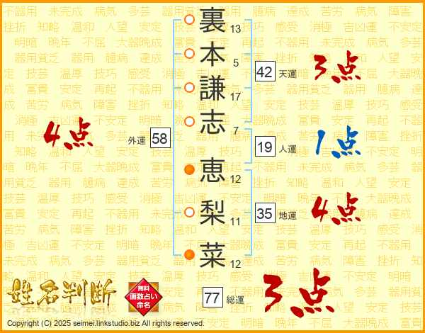 裏(13画)本(5画)謙(17画)志(7画) 恵(12画)梨(11画)菜(12画)