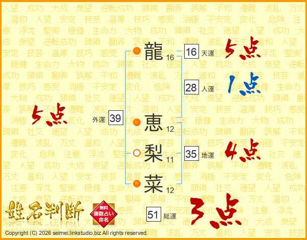龍(16画) 恵(12画)梨(11画)菜(12画)