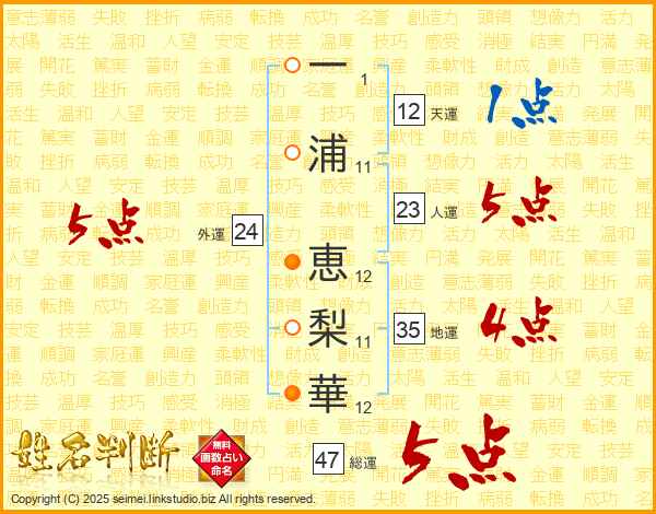 一(1画)浦(11画) 恵(12画)梨(11画)華(12画)