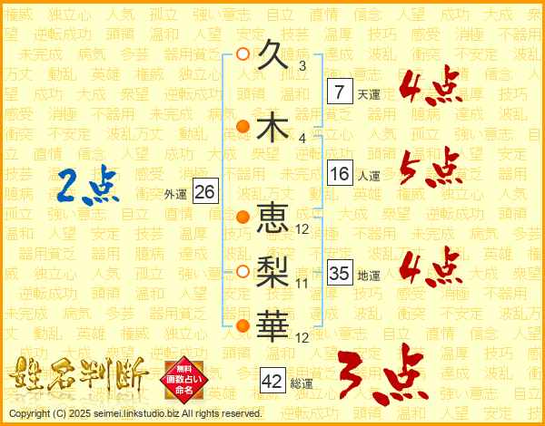 久(3画)木(4画) 恵(12画)梨(11画)華(12画)