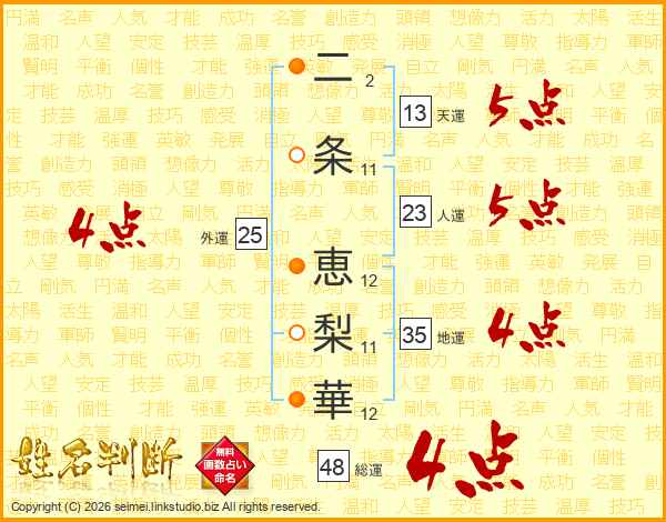 二(2画)条(11画) 恵(12画)梨(11画)華(12画)