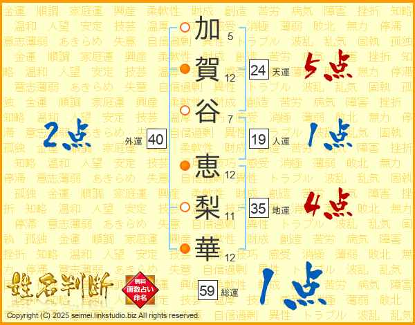 加(5画)賀(12画)谷(7画) 恵(12画)梨(11画)華(12画)