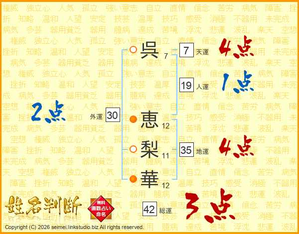 呉(7画) 恵(12画)梨(11画)華(12画)