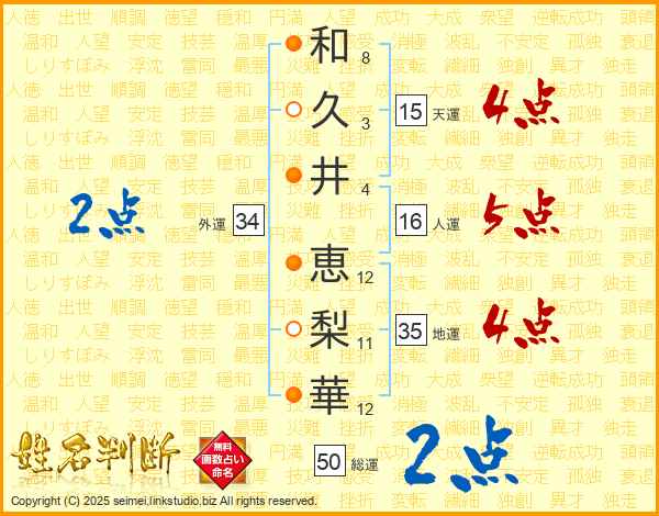 和(8画)久(3画)井(4画) 恵(12画)梨(11画)華(12画)