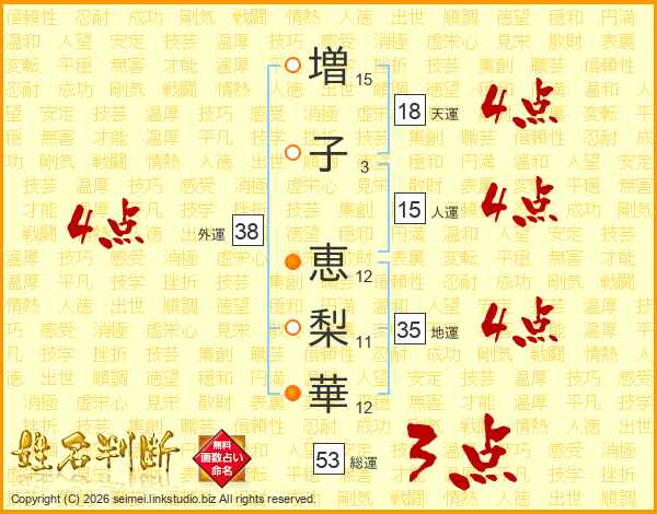 増(15画)子(3画) 恵(12画)梨(11画)華(12画)