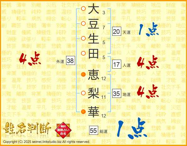 大(3画)豆(7画)生(5画)田(5画) 恵(12画)梨(11画)華(12画)
