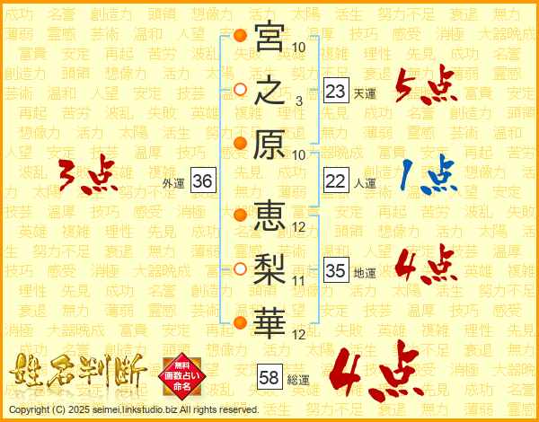 宮(10画)之(3画)原(10画) 恵(12画)梨(11画)華(12画)