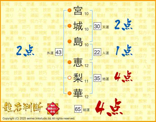 宮(10画)城(10画)島(10画) 恵(12画)梨(11画)華(12画)