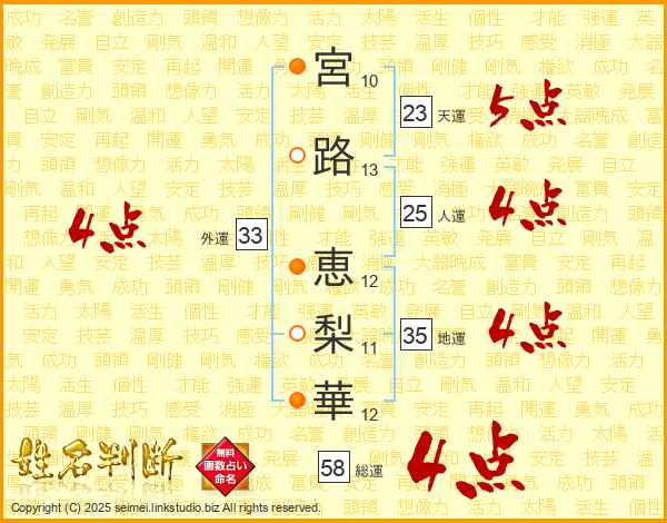 宮(10画)路(13画) 恵(12画)梨(11画)華(12画)