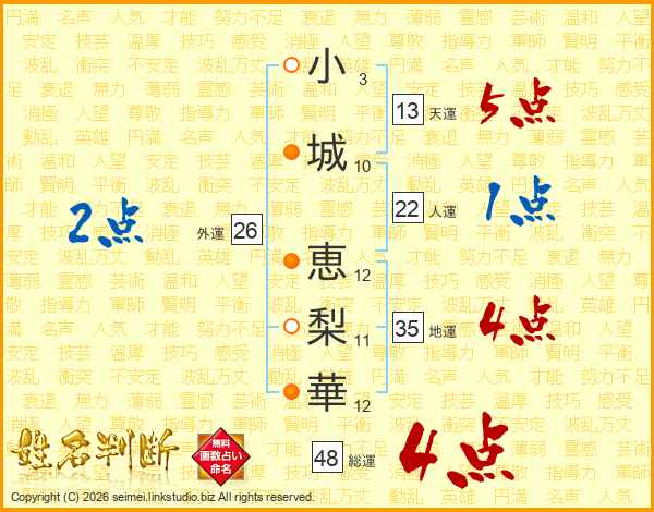 小(3画)城(10画) 恵(12画)梨(11画)華(12画)