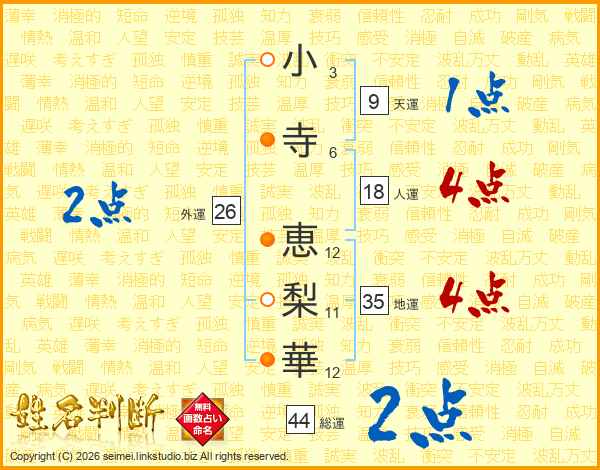 小(3画)寺(6画) 恵(12画)梨(11画)華(12画)