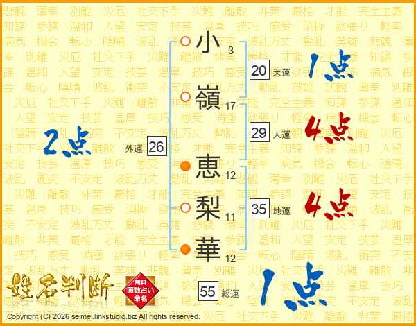 小(3画)嶺(17画) 恵(12画)梨(11画)華(12画)