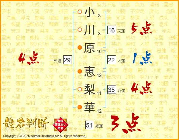 小(3画)川(3画)原(10画) 恵(12画)梨(11画)華(12画)