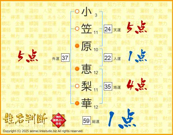 小(3画)笠(11画)原(10画) 恵(12画)梨(11画)華(12画)