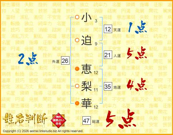 小(3画)迫(9画) 恵(12画)梨(11画)華(12画)