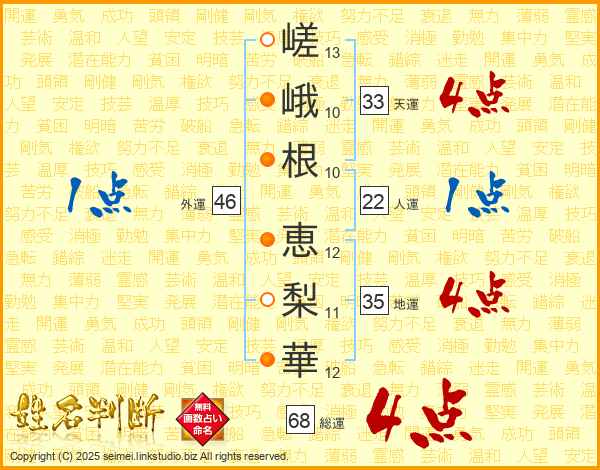 嵯(13画)峨(10画)根(10画) 恵(12画)梨(11画)華(12画)