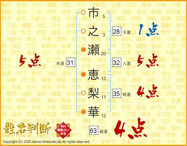 市(5画)之(3画)瀬(20画) 恵(12画)梨(11画)華(12画)