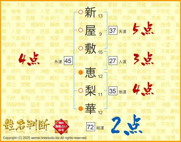 新(13画)屋(9画)敷(15画) 恵(12画)梨(11画)華(12画)