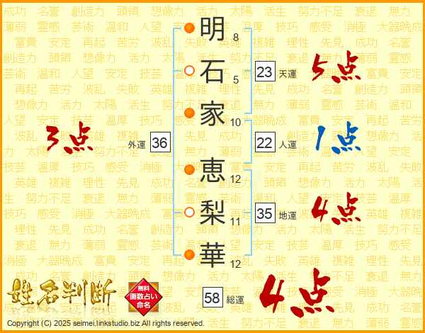 明(8画)石(5画)家(10画) 恵(12画)梨(11画)華(12画)