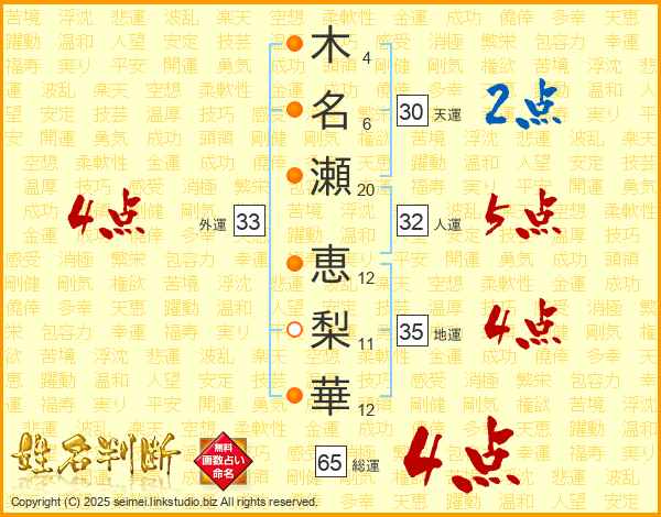 木名瀬恵梨華さんの総運は65画の4点!