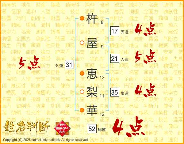 杵(8画)屋(9画) 恵(12画)梨(11画)華(12画)