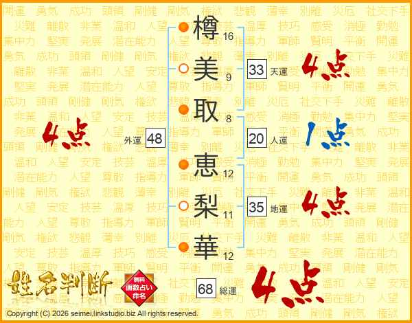 樽(16画)美(9画)取(8画) 恵(12画)梨(11画)華(12画)