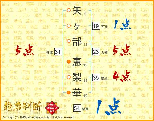 矢(5画)ヶ(3画)部(11画) 恵(12画)梨(11画)華(12画)