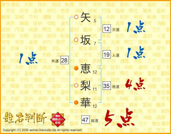 矢(5画)坂(7画) 恵(12画)梨(11画)華(12画)