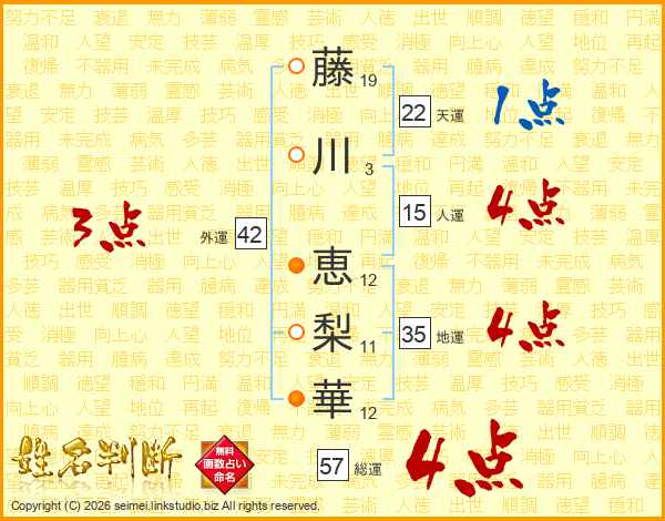藤(19画)川(3画) 恵(12画)梨(11画)華(12画)