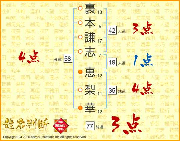 裏(13画)本(5画)謙(17画)志(7画) 恵(12画)梨(11画)華(12画)
