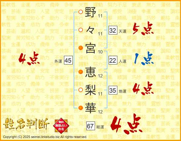 野(11画)々(11画)宮(10画) 恵(12画)梨(11画)華(12画)