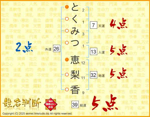と(2画)く(1画)み(3画)つ(1画) 恵(12画)梨(11画)香(9画)