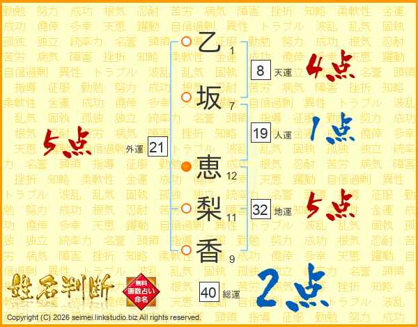 乙(1画)坂(7画) 恵(12画)梨(11画)香(9画)