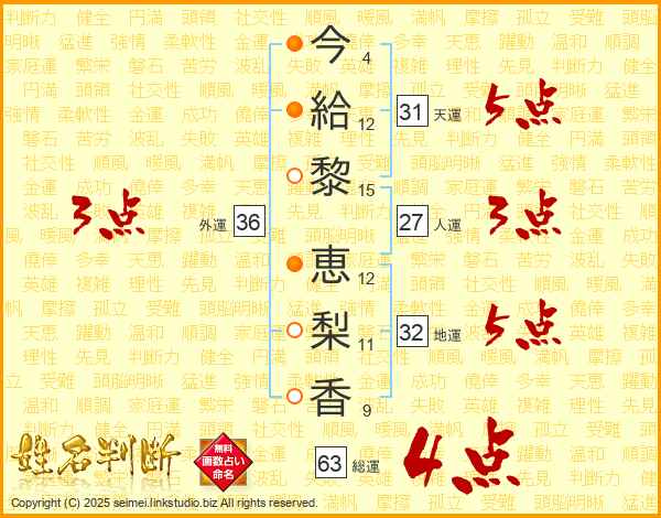 今(4画)給(12画)黎(15画) 恵(12画)梨(11画)香(9画)