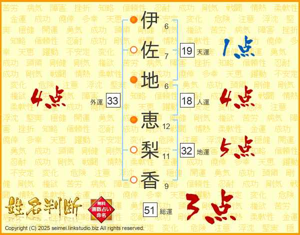 伊(6画)佐(7画)地(6画) 恵(12画)梨(11画)香(9画)
