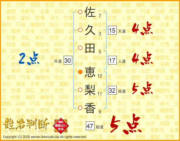 佐(7画)久(3画)田(5画) 恵(12画)梨(11画)香(9画)