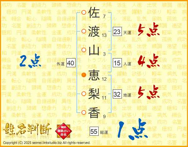 佐(7画)渡(13画)山(3画) 恵(12画)梨(11画)香(9画)